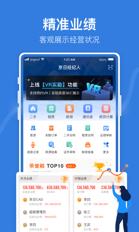 实时跟进房客信息,捕捉最新的房客动态。精准展示经纪人业绩,反馈经营状况。