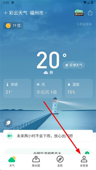 1、在彩云天气主界面,点击底部导航栏的未登录选项,进入个人相关页面。