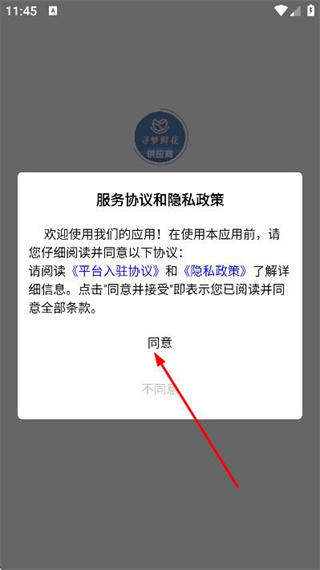 1、在应用弹出的服务协议和隐私政策窗口中,点击同意按钮,进入登录页面。