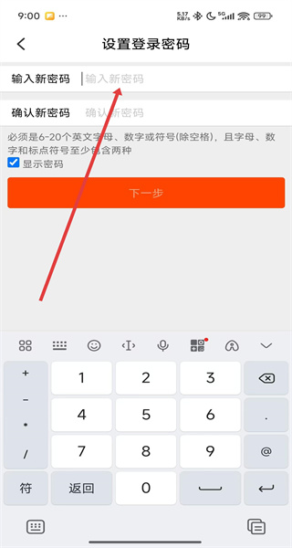 4、输入接收到的验证码后,进入设置登录密码的页面,在输入新密码的输入框中,填写满足要求的新密码。