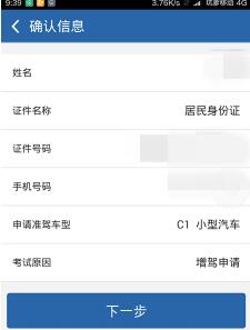 3.核对自己信息,确认无误后,点击下一步。在这里要提醒下,因为有些人已经是有摩托车证或者其他驾驶证,所以我们可以看到考试原因写着:增驾申请。一般无证新手申请都是写着:初次申请。