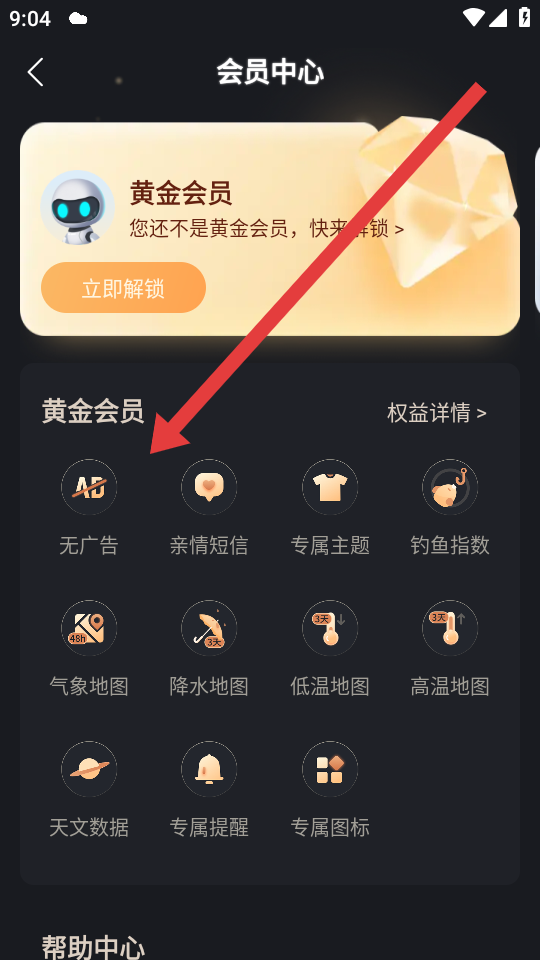 3、在会员中心页面,需要通过解锁开通黄金会员,来进行享受无广告的权益,关闭天气页面广告。