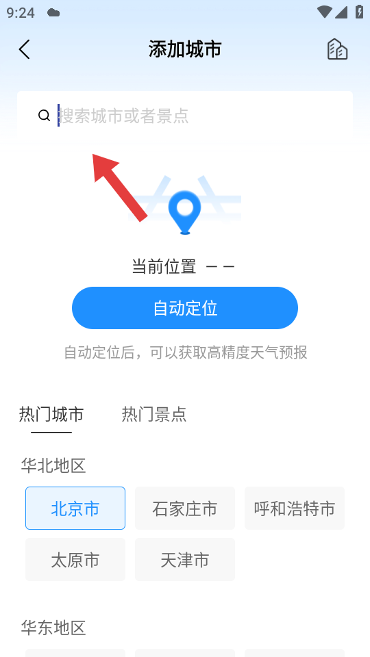 3、这边选择进入添加城市页面后,在搜索框输入城市名称/景点,或直接点击热门城市列表中的目标城市,即可切换定位至该城市。
