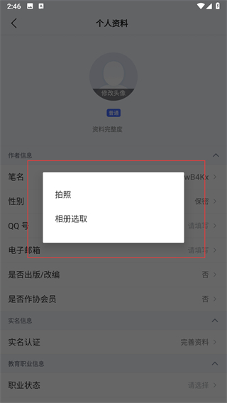 4、在弹出的菜单中,选择拍照或相册选取方式,按提示完成头像更换操作。