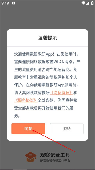 1、在温馨提示弹窗中,点击同意,进入数智教研工作平台的登录页面。