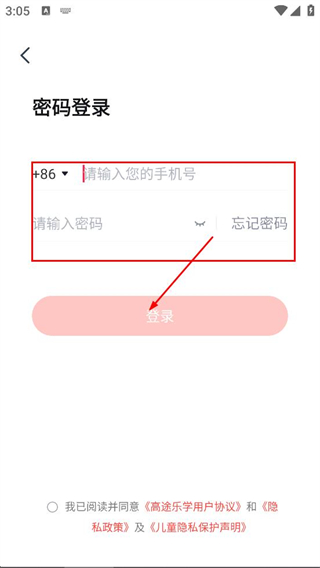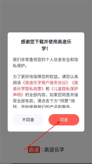 1、在高途乐学的协议弹窗中,点击同意,进入登录页面。