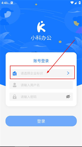 2、在小科办公的账号登录页面,点击请选择企业标识选项,完成企业标识的选择操作。