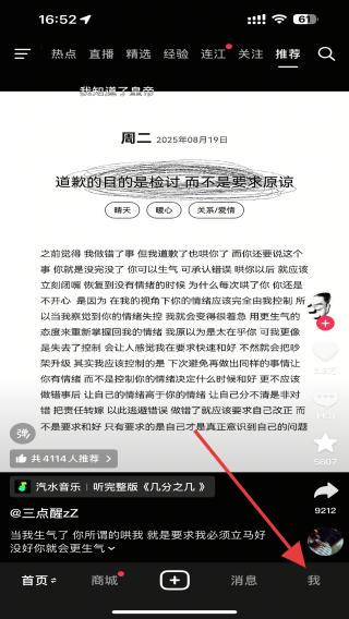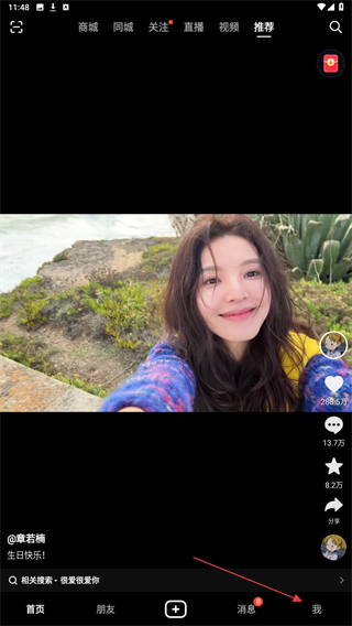 1、启动抖音APP进入到视频播放页面,再点击底部导航栏最右侧的我。