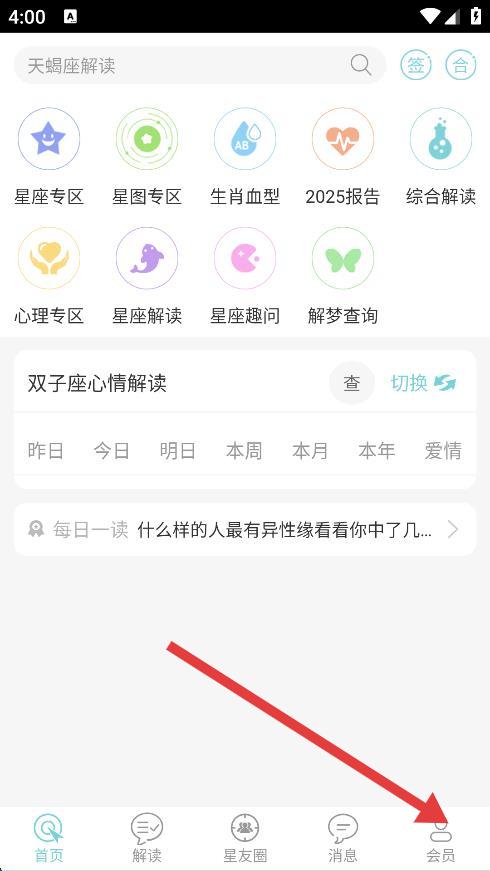 1、打开星座运势大全,点击底部导航栏最右侧的会员选项。