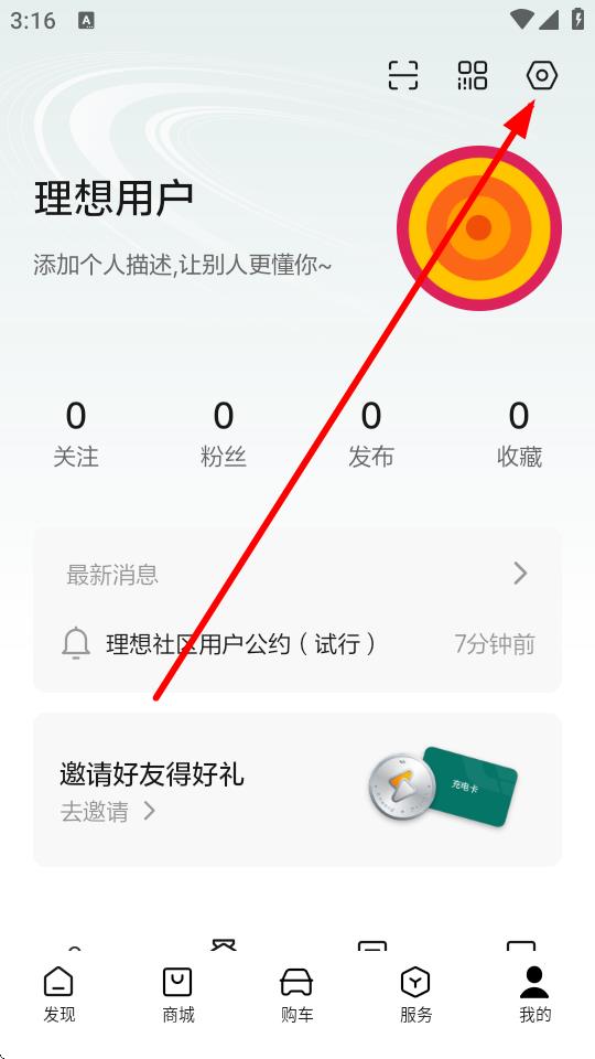1、打开理想汽车app,在我的页面点击右上角设置图标,进入设置页面。