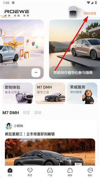 1、打开上汽荣威app,点击右上角预约试驾选项,进入预约试驾页面。