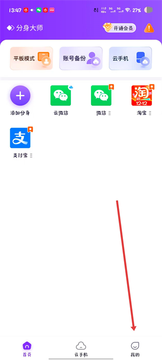 1、打开分身大师应用,点击底部导航栏最右侧的我的选项,进入个人中心页面。