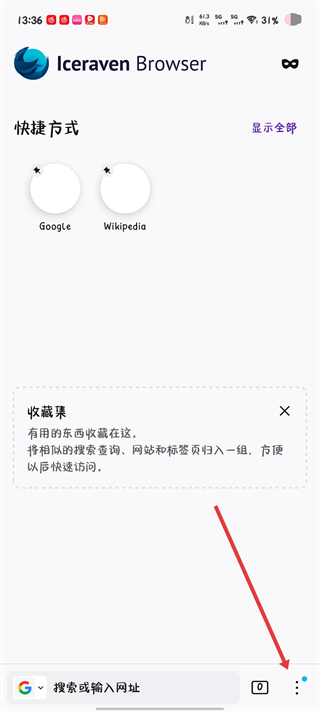 1、打开Iceraven浏览器进入首页,点击页面右下角的三点菜单按钮。