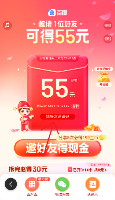 3、点击后进入邀请好友活动界面,在中间的红包位置有一个【填写好友邀请码】的选项,点击一下即可填写好友的邀请码。