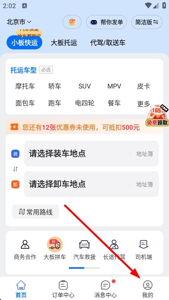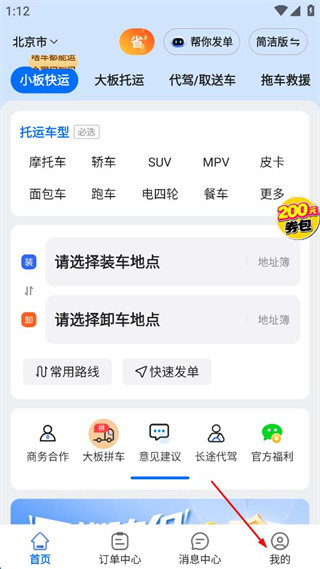 1、打开车拖车软件,进入首页查看托运相关功能,点击底部我的选项进入个人页面。