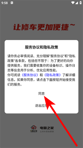 1、打开电喷之家,在弹出的提示框,点击同意,进入主界面。
