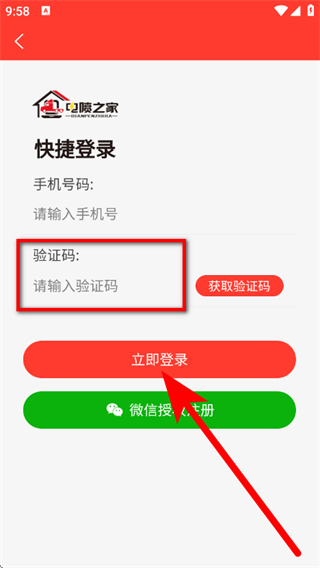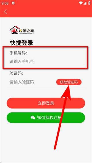 3、在快捷登录页面,输入手机号,点击获取验证码。