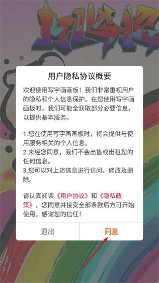 1、打开写字画画板软件,查看弹出的用户隐私协议概要,点击同意按钮进入绘画界面。