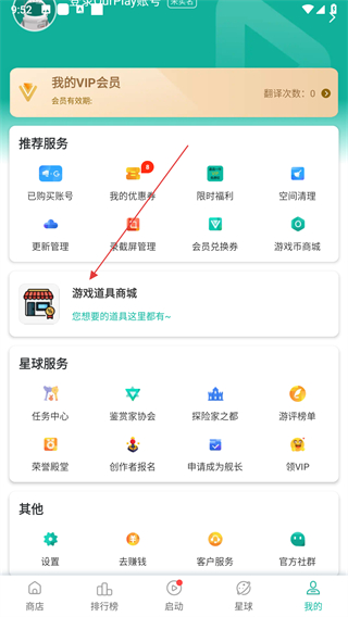 2、在个人页面点击游戏道具商城选项,进入游戏商城页面。