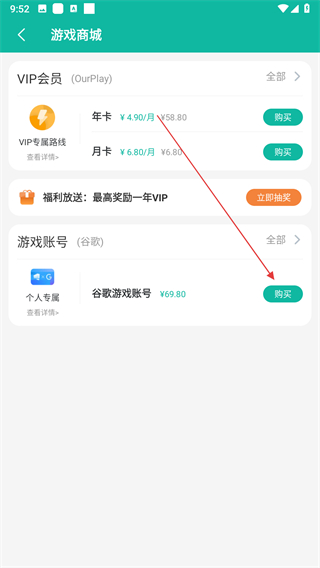 3、在游戏商城页面找到谷歌游戏账号选项,点击购买按钮。