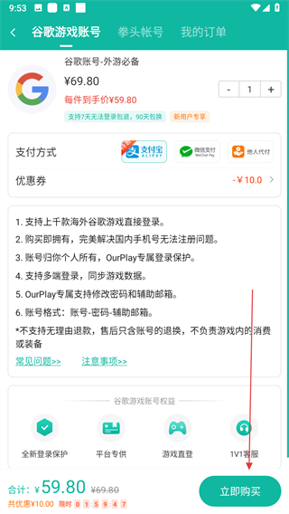 4、进入谷歌游戏账号购买页面后,选择支付方式,点击立即购买。