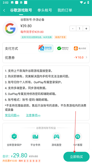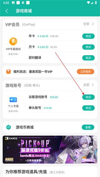 3、在商城页面,点击谷歌游戏账号的购买按钮。