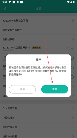 3、在设置页面点击重新安装谷歌套件选项,弹出提示框。