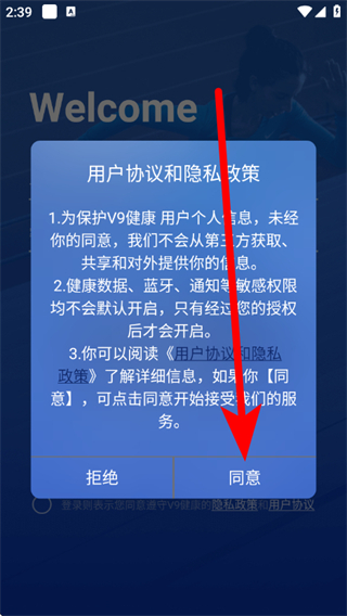 1、打开V9健康,在提示框,点击同意,进入登录界面。