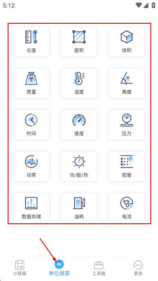 2、在工具箱页面浏览各类工具,点击底部单位换算选项切换至对应页面。