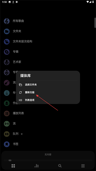 3、在弹出的选项中,点击重新扫描,会自动扫描设备内的音频文件。