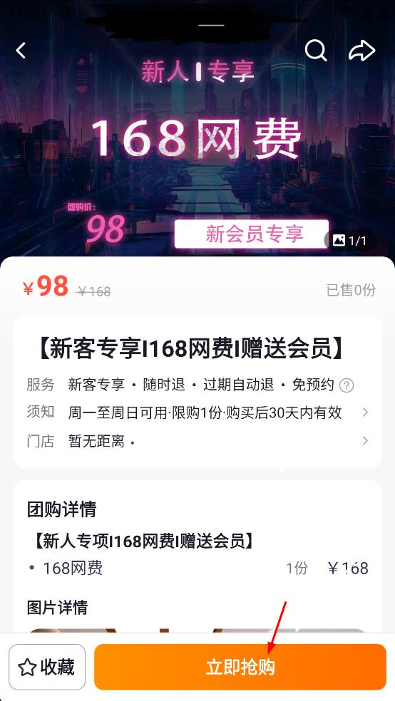 3、进入新人专享168网费详情页面,查看网费团购的价格、服务、须知、门店等信息,确认要购买后,找到立即抢购按钮。