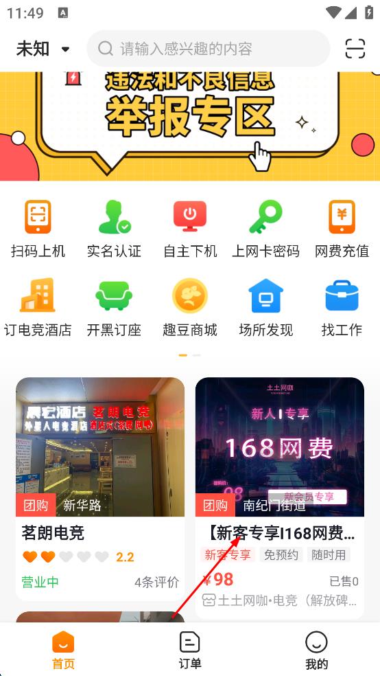 2、进入APP主界面,在页面中找到显示新人专享168网费的团购推荐内容,点击该内容。