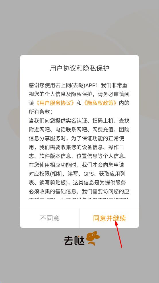 1、打开去上网APP,在弹出的用户协议和隐私保护页面,点击同意并继续,进入附近网吧网吧活动界面后,点击立即开启上网之旅。