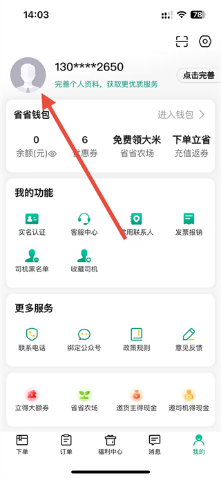 1、打开省省回头车app,进入主界面,点击底部导航栏中的我的图标,进入个人界面。