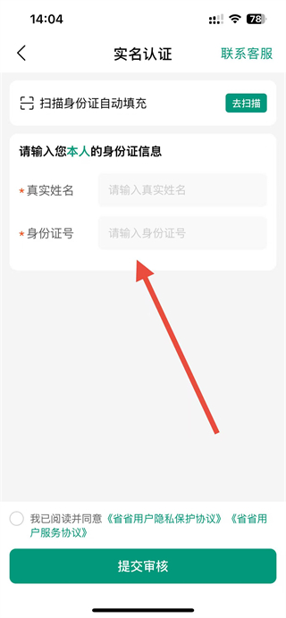 4、在实名认证页面,输入真实姓名和身份证号,勾选同意协议后点击提交审核完成认证。