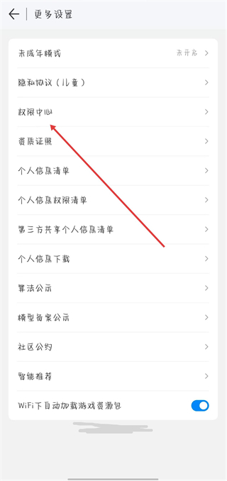 3、在更多设置页面,点击权限中心选项。