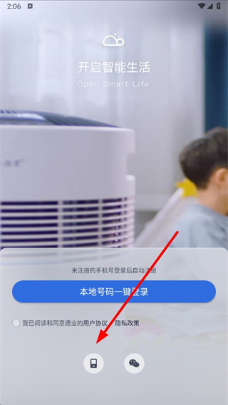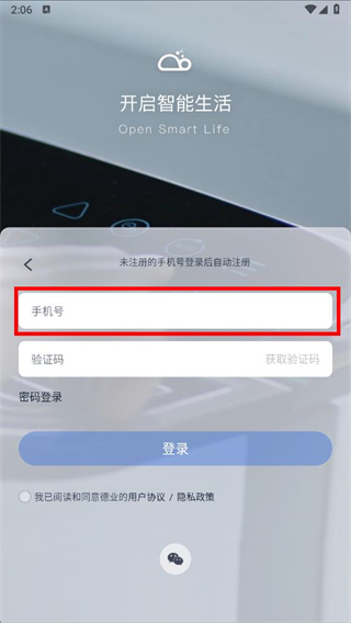 1、打开德业智能app,在登录页面点击手机图标,进入手机号登录页面。
