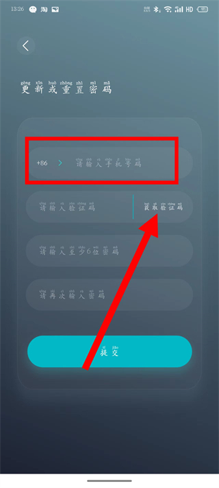 3、在重置密码页面,输入手机号码,点击获取验证码。