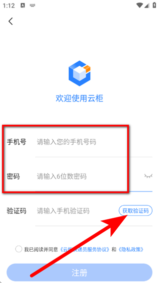 3、在注册页面,输入手机号码和密码,点击获取验证码。