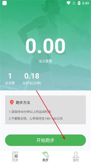 2、在跑步页面确认跑步方法提示后,点击开始跑步,进入跑步记录界面。