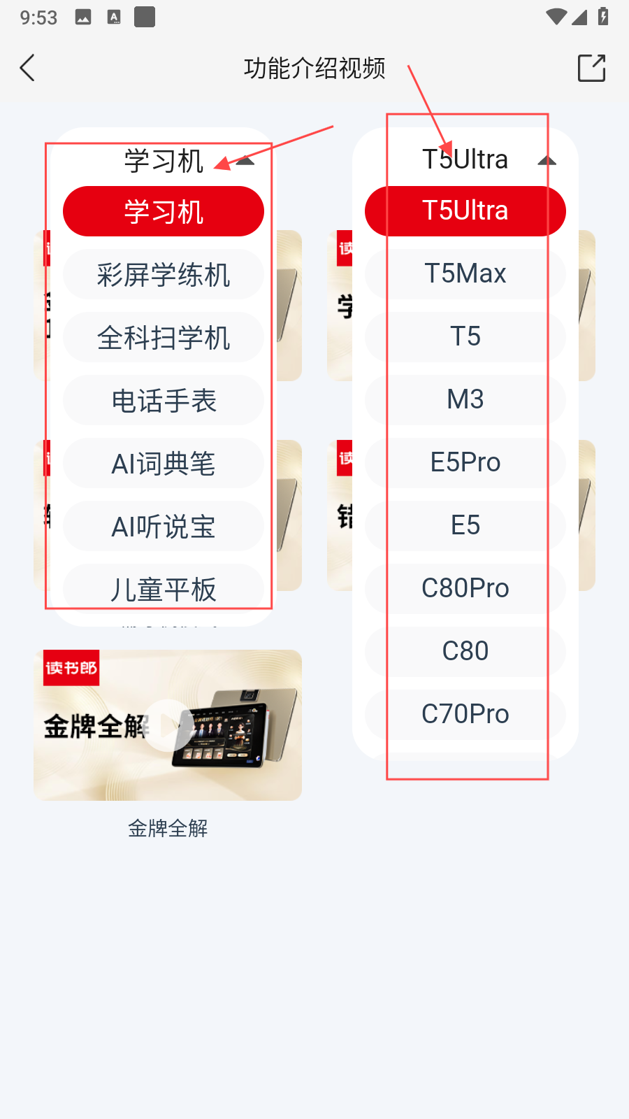 2、在功能介绍视频界面,通过点击左上角学习机下拉菜单,选择具体的产品类别,再点击右上角的产品型号下拉菜单,选择对应的型号。