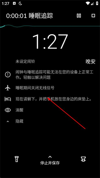 3、睡眠结束后,点击停止并保存,即可完成睡眠追踪并保存记录。