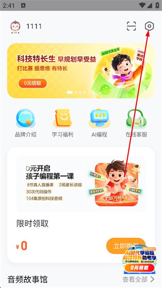 1、打开猿编程app,点击首页右上角的设置图标。