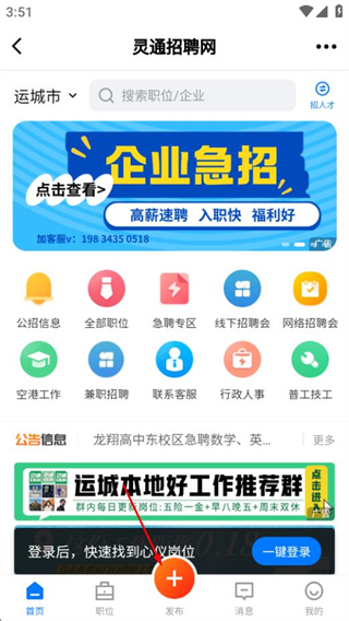 2、在灵通招聘网页面,点击一键登录按钮,进入登录页面。
