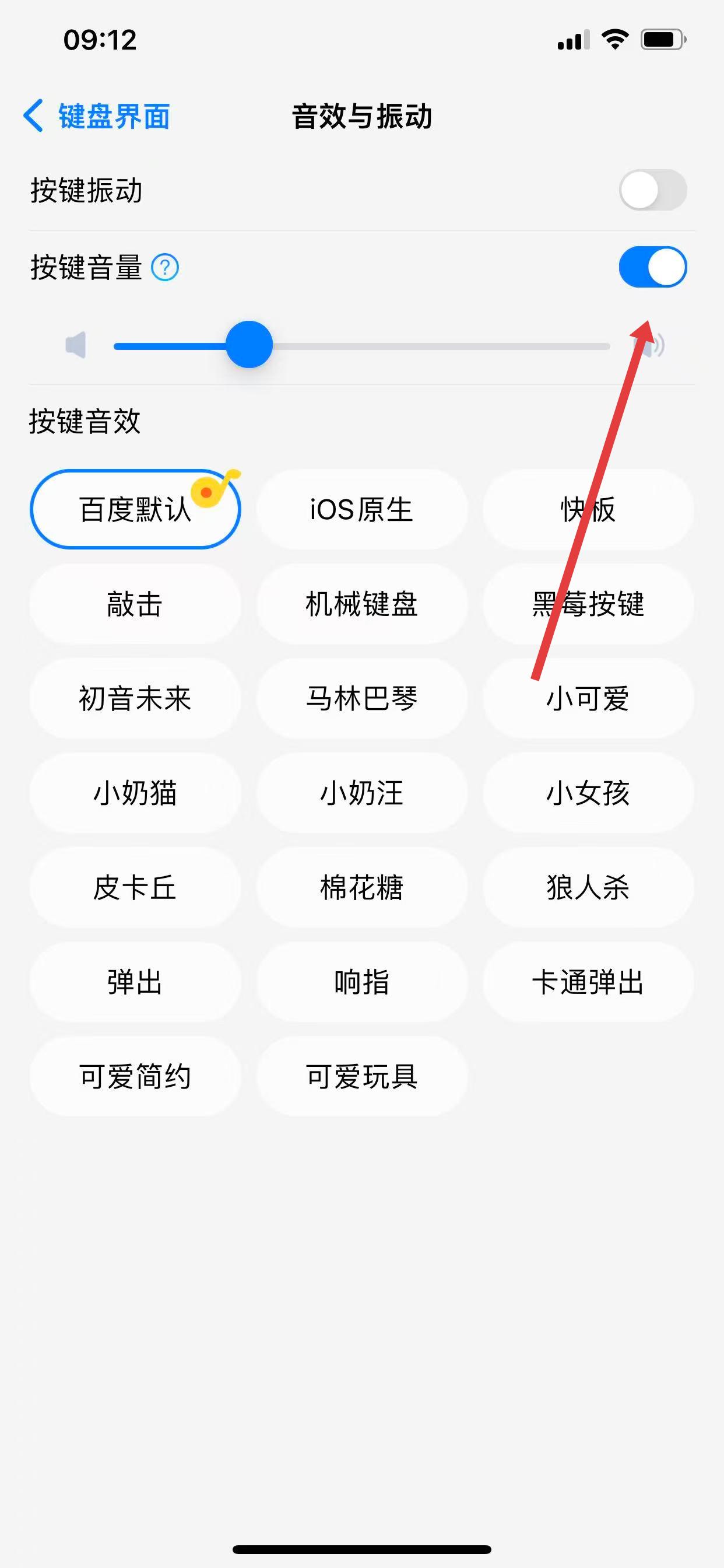 3、找到按键音量开关,将其关闭,即可关闭百度输入法的按键声音。