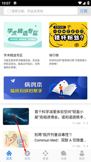 1、打开医库app的首页,点击底部导航栏的发现,进入功能集合页面。