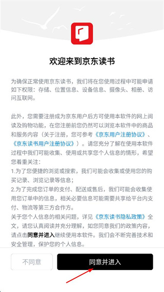 1、打开京东读书APP后,查看弹出的政策及权限说明内容,确认后点击同意并进入按钮。