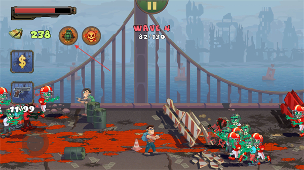 3、击杀僵尸获得金币、钻石等资源,可升级武器,界面上方的道具图标点击即可释放,用于清理密集僵尸群。