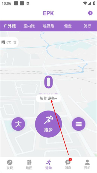 1、打开EPK的“运动”页面,点击智能设备+,进入设备列表页面。