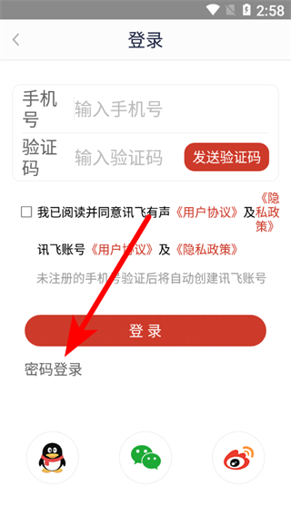 3、在登录页面,点击密码登录选项,切换到密码登录界面。
